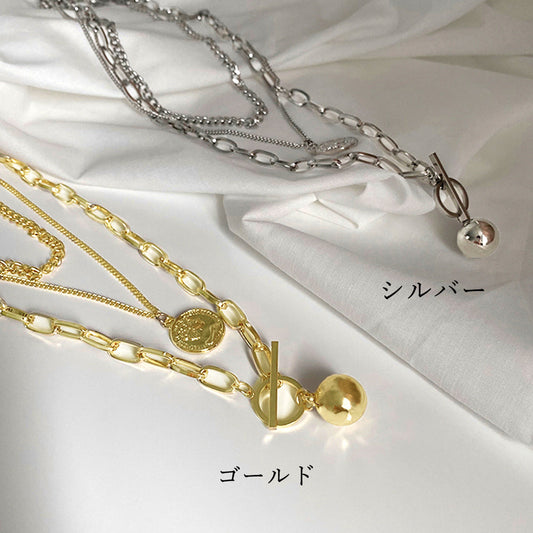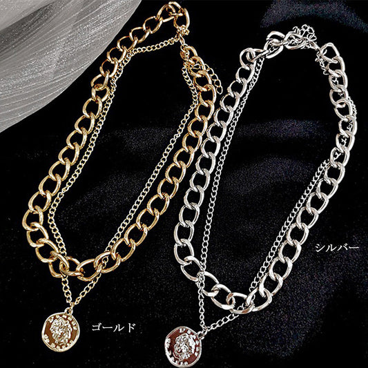 3連 チェーンチョーカー ネックレス 2点セット 重ね付け コインモチーフ ショート メタル ジュエリー