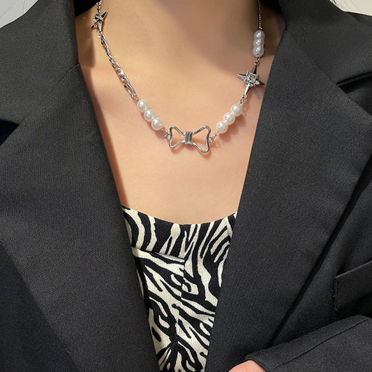 ネックレス リボン モチーフ レディース 星モチーフ チェーンネックレス フェイクパール キラキラ 切替