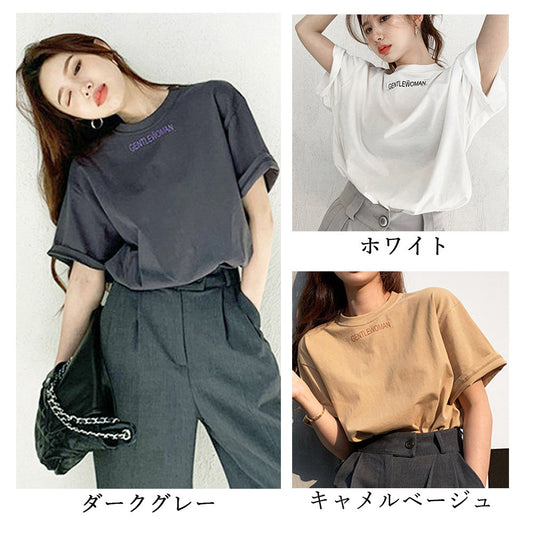 英字ロゴ 半袖Tシャツ ロングT 着やせ プリントTシャツ ラウンドネック ゆったり おしゃれ
