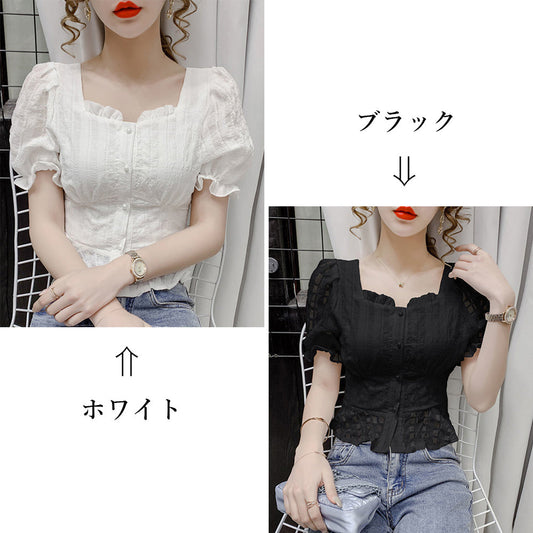 スクエアネック ブラウス パフスリーブ 薄手トップス フェミニン 半袖シャツブラウス 春夏