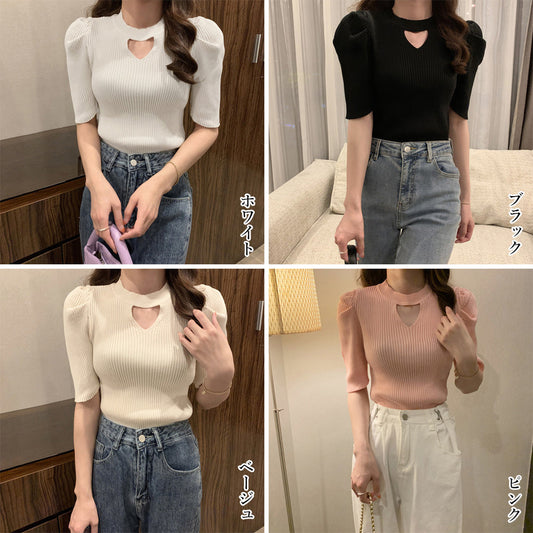 リブニットトップス サマーニット カットソー プルオーバー パフスリーブ tシャツ おしゃれ