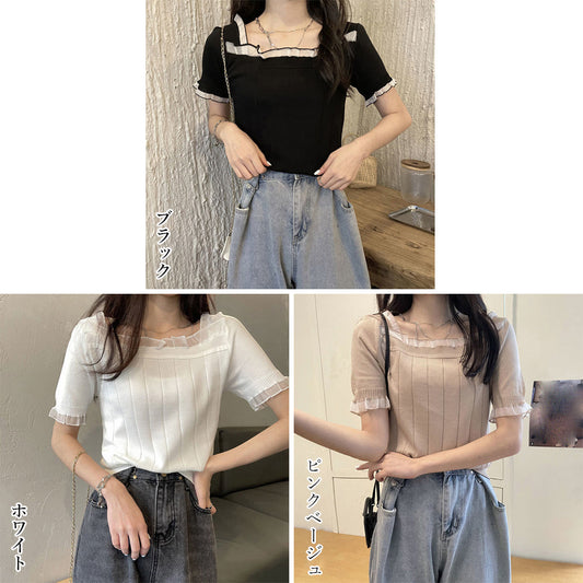 スクエアネック サマーニット レース付き ニットウェア 半袖 薄手ニットソー プルオーバー
