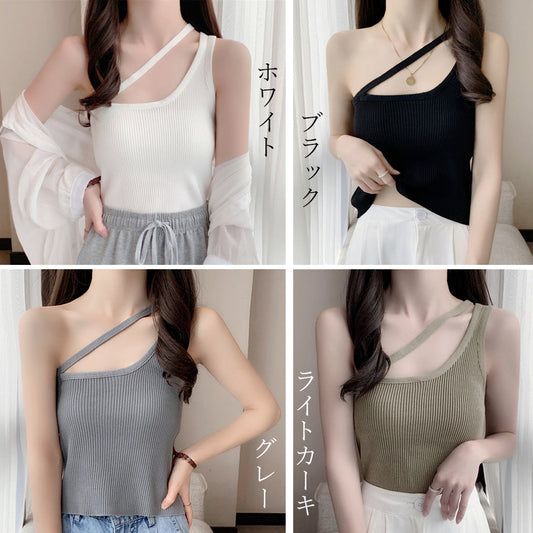 タンクトップ ショート丈 サマーニット 重ね着 リブニット セクシー インナー 斜め襟 ニットトップス 肩出し