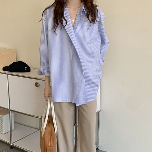 ストライプ柄 シャツ 長袖 ロングシャツ レディース シンプル オフィスカジュアル トップス 開襟 シャツブラウス 重ね着
