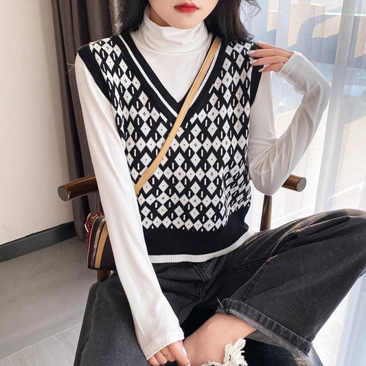 ニットベスト Vネック トップス 黒 ジャガードニットベスト ノースリーブ プルオーバー 重ね着 コンパクトベスト