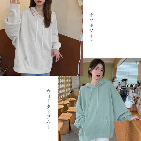 フード付きtシャツ レディース スウェットトレーナー 薄手長袖 肩出し フーディー ボリューム袖 カジュアル トップス 無地