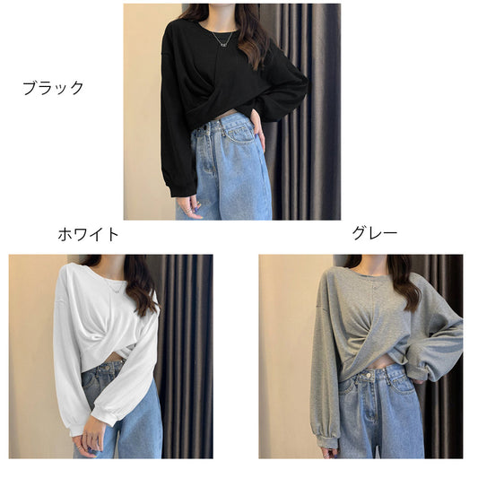 ショート丈トップス へそ出し カットソー レディース 長袖 カジュアル フロントクロス ショートTシャツ 無地