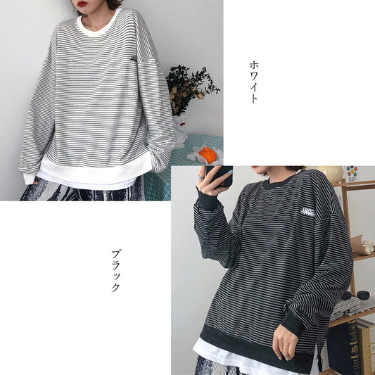 ボーダー柄 トップス レディース ラウンドネック レイヤード風 プルオーバー 長袖 重ね着風