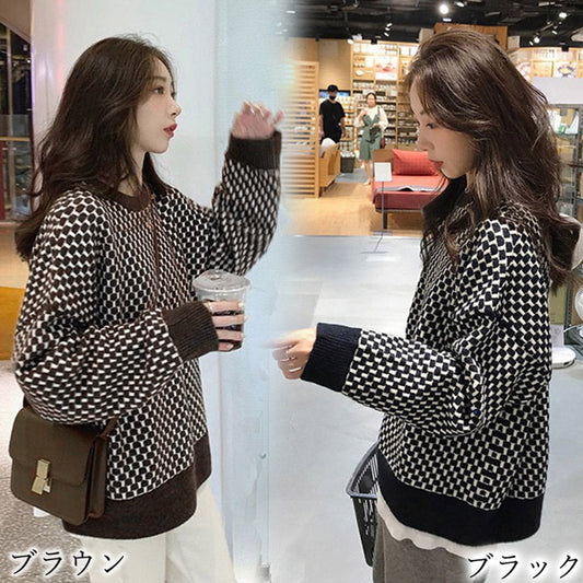 ブロックチェック柄 ニットトップスレディース レトロチェック柄 ニットセーター ニットプルオーバー 長袖 ニットソー ゆったりおしゃれ