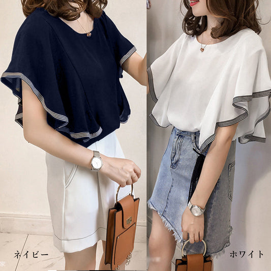 シフォン袖フリルトップス オフィス 薄手 シャツブラウス レディース 軽い フレア袖 フリル袖