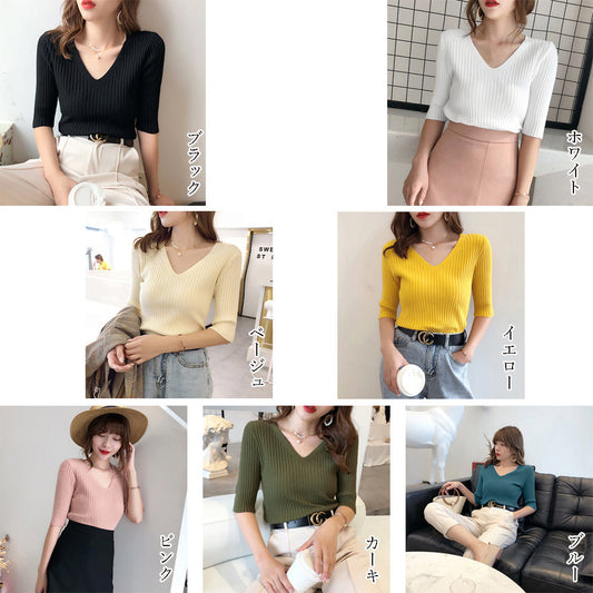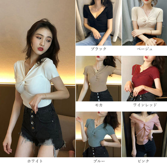 リブ編みニット トップス Vネック 半袖 カジュアル ニットソー タイトニット 無地 シンプル ニットソー