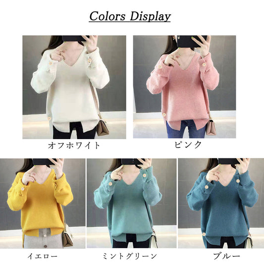 ボタン飾り ニットトップス レディース Vネック 長袖 ニットセーター 無地 プルオーバー