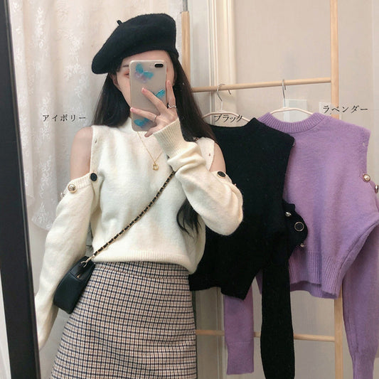 肩出し ニットセーター レディース トップス プルオーバー オフショルダーニット 長袖 ショット丈