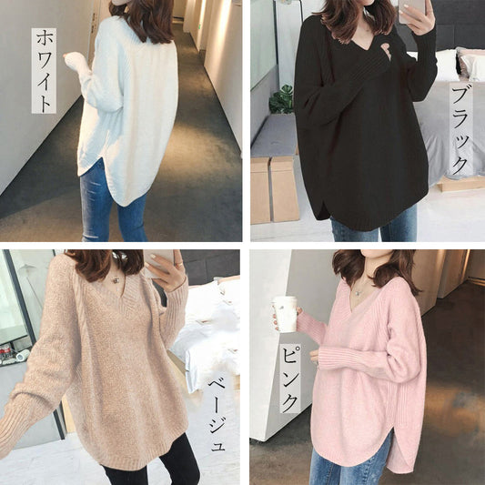 Vネック ラウンドスリットニット レディース トップス ロングニット カジュアル ゆったり かわいい