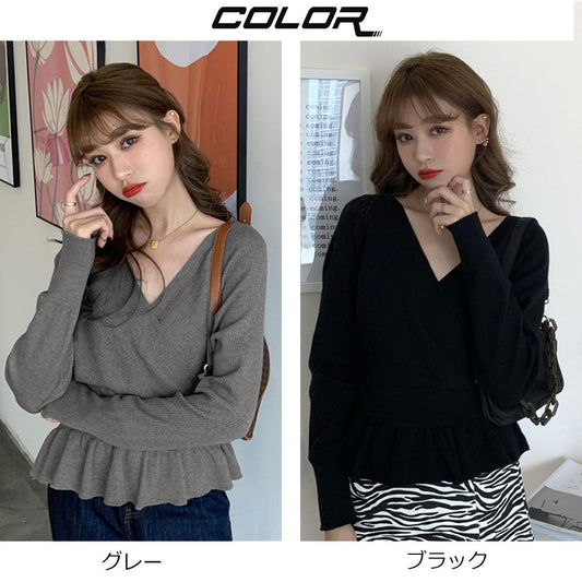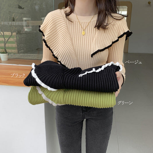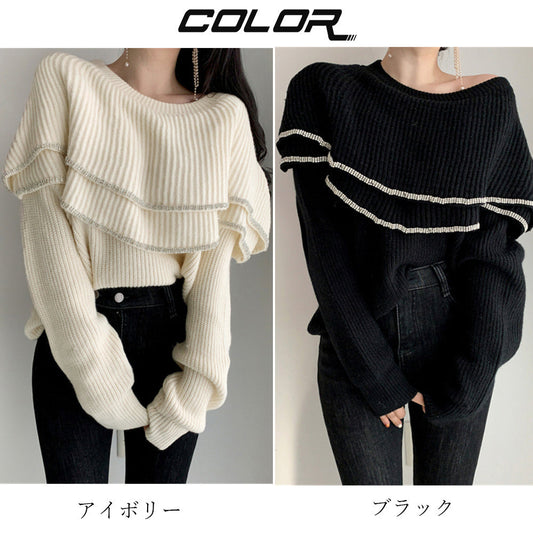 フリル ニットトップス レディース トップス 長袖 ニットソー 無地 ニットセーター 2way