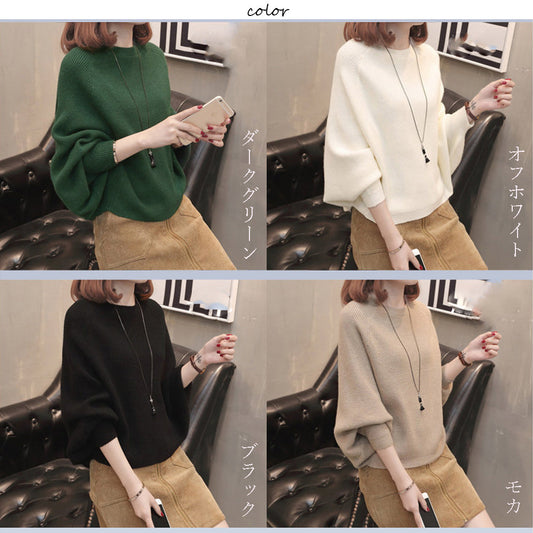 ドルマンスリーブ ニットセーター レディース トップス ゆったり リブニット トップス 無地 クールネック