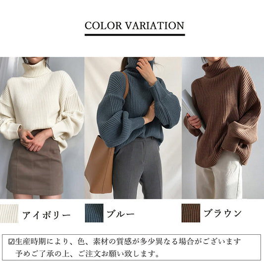 タートルネック リブニットセーター レディース トップス バルーンスリーブ ハイネック ニットトップス