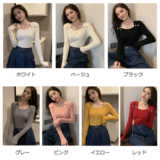 スクエアネック リブニット レディース トップス タックギャザー タイトニット トップス ボダン