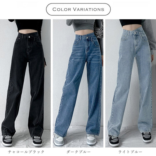 ストレートデニム ウエストレイヤード風 デニムパンツ ハイウエスト ジーンズ セミワイド 定番デニム