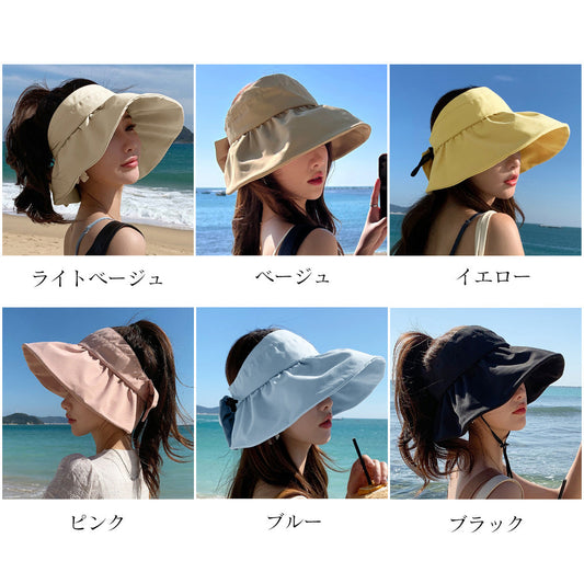 サンバイザー 小顔 UV対策 帽子 レディース つば広 あご紐付き ハット バックリボン サイズ調節