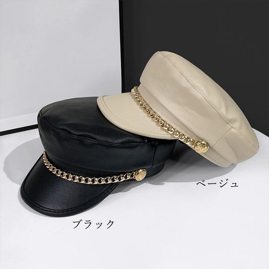 レザーキャスケット フェイクレザーキャスケット チェーン付き 帽子 マドロスハット マリンハット PUレザーキャップ