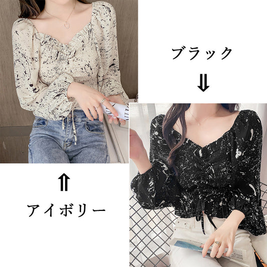 2way トップス シャーリング ボリュームスリーブ 肌見せトップス 薄手 シャツブラウス 長袖 肩見せ トップス シフォンブラウス
