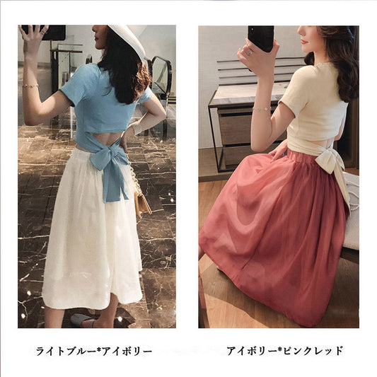2点セットアップ Tシャツ スカート トレンディツーピース シフォンスカート バックリボン 水色