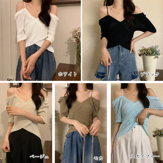 サマーニット オフショルダー ニットトップス レディース 2way クロスリブニット Vネック セクシーリブニット