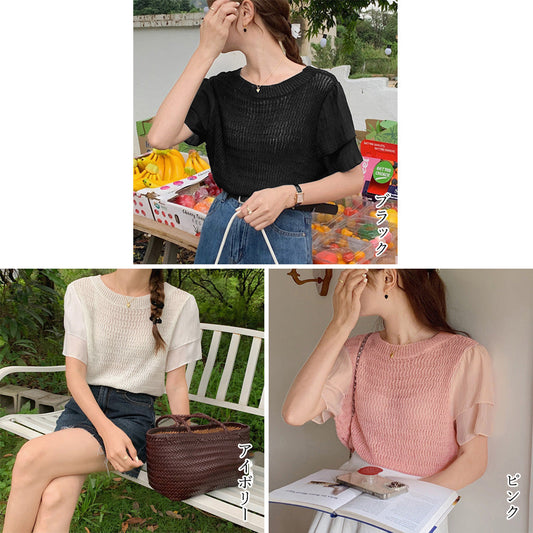 サマーニット 透かし編み ニットトップス レディース ラウンドネック ニットプルオーバー フレアスリープ