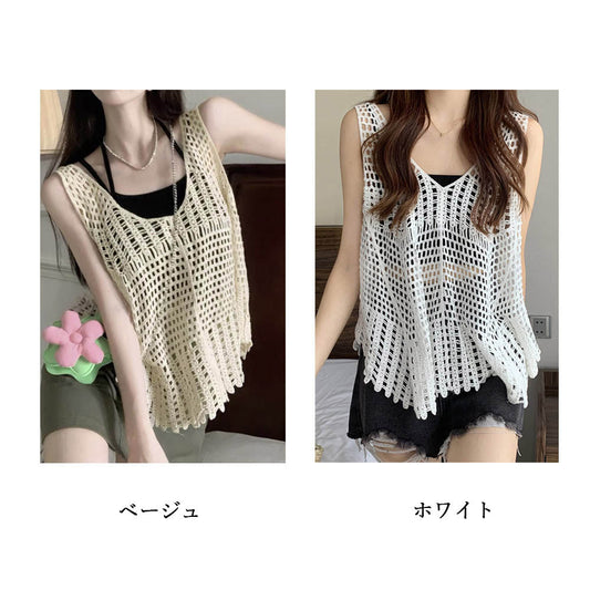 ニット トップス かぎ針編み風 ビスチェ 重ね着 シンプル 透かし編みベスト 春夏 セクシー タンクトップ