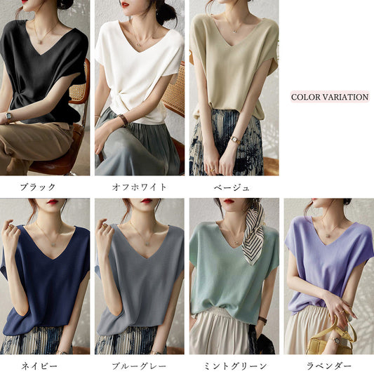 ニットトップス レディース 春秋夏 フレンチスリーブ ニットソー 体型カバー vネック 冷感タッチ