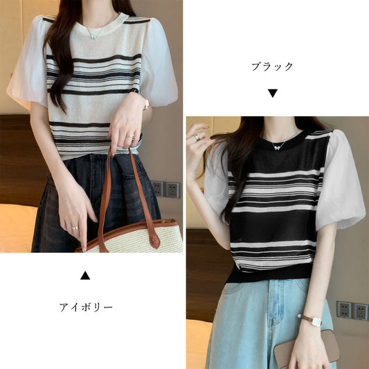 サマーニット 異素材切り替え ニットトップス レディース パフスリーブ 透かし編みニット 大人可愛い