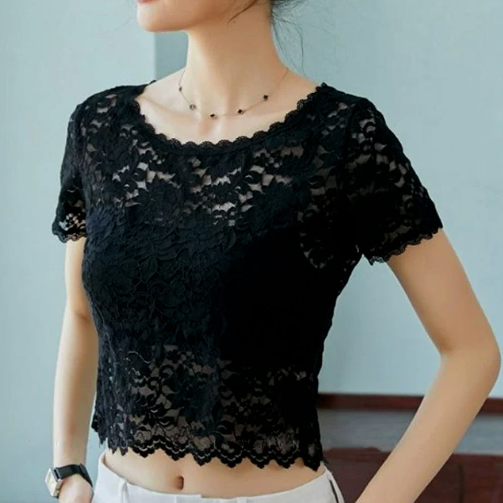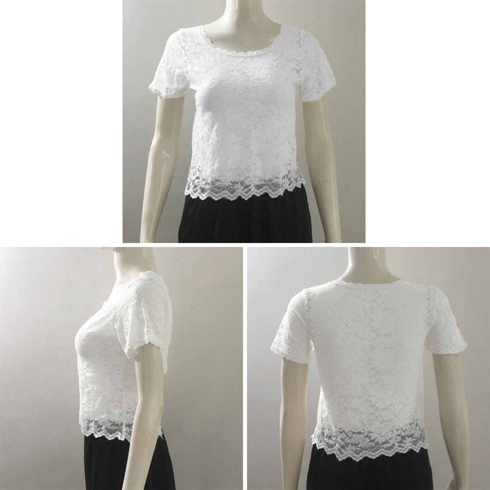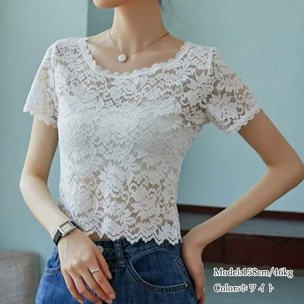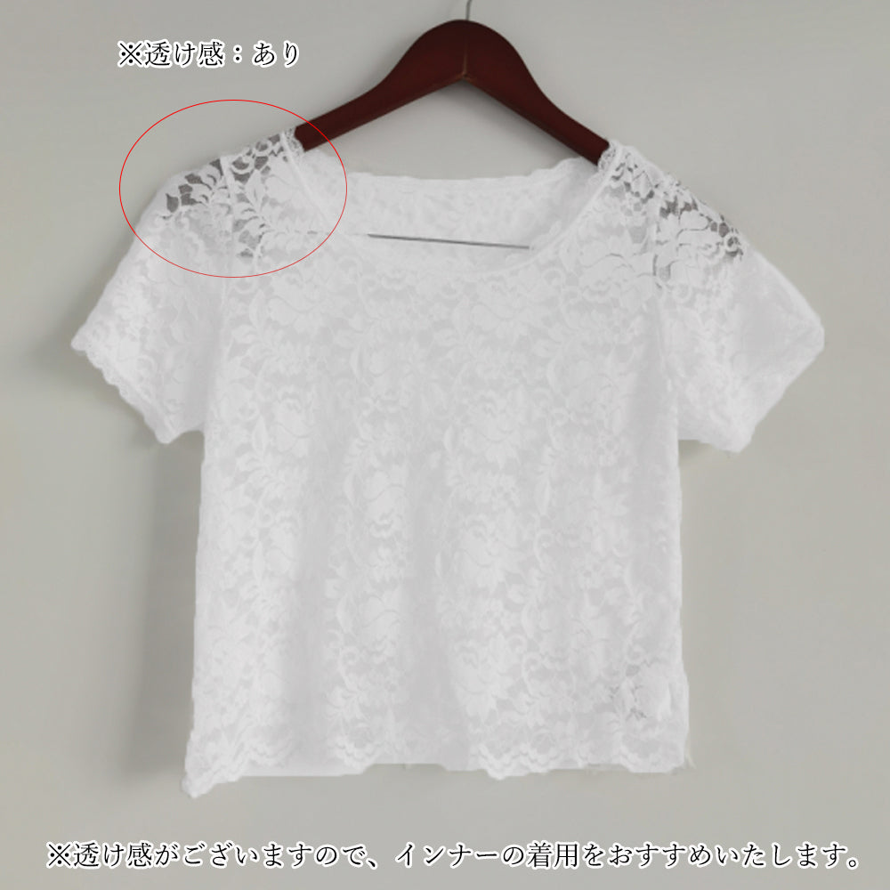 エレガント ブラウス シャツトップス 透け感 レディース 重ね着インナー 大人可愛い 肌見せ 薄手 シアーブラウス きれいめ トップス 花柄レーストップス 半袖ブラウス 春夏 繊細なレース素材を使用、大人っぽくフェミニンに仕上げた半袖ブラウス 程よく体にフィットするのですっきりとしたシルエット キャミやチューブトップなどとの重ね着がおすすめ 素材:ポリエステル100% カラー:ブラック/ホワイト サイズ:ワンサイズ 着丈:約47cm 肩幅:約33cm 袖丈:約17cm ゆき:約33.5cm 身幅:約42cm 胸囲:約84-120cm 裏地:なし 伸縮性:あり 透け感:あり ※透け感がございますので、インナーの着用をおすすめいたします