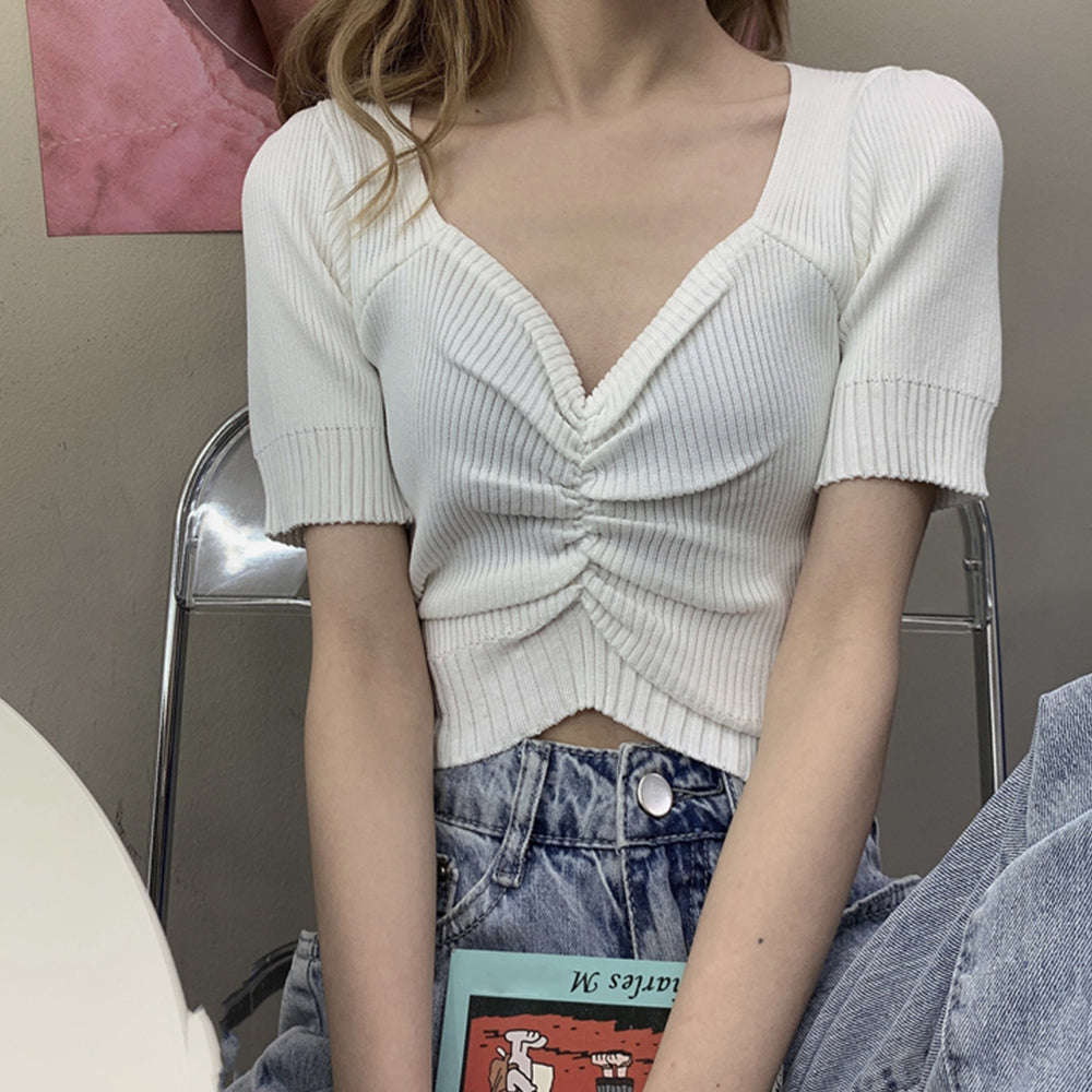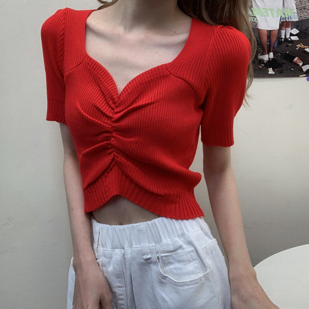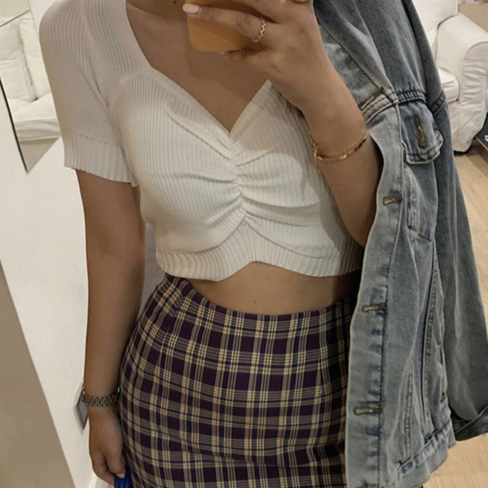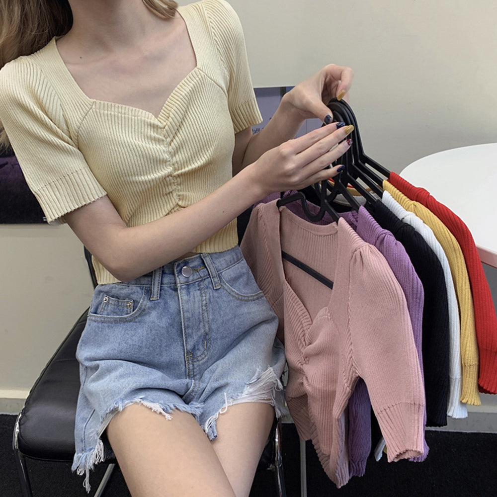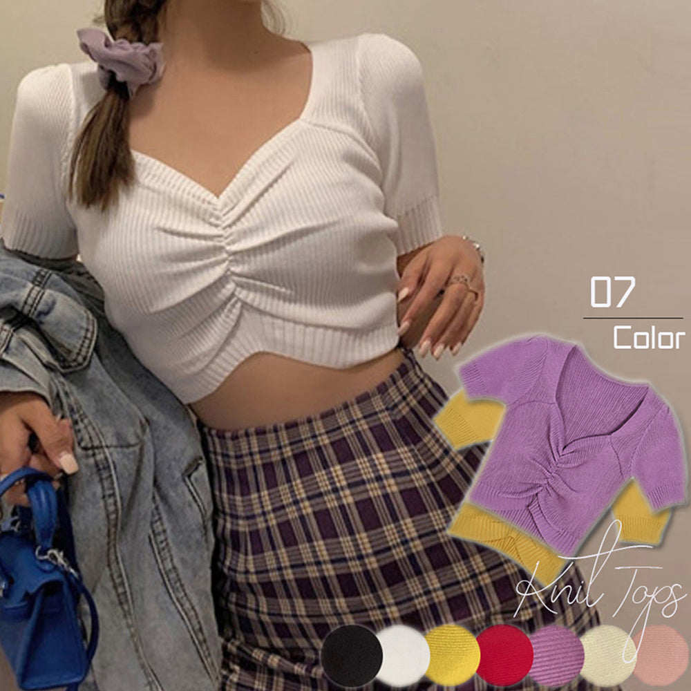 フロントに入ったシャーリングがアクセントの細身トップスです スクエアネックデザインが女性らしくてセクシー デニムや柄物スカートと合わせやすいデザインなので、デイリー使いにもピッタリ カラー:ブラック/ホワイト/ベージュ/イエロー/ラベンダー/レッド/薄ピンク 素材:綿65%+ポリエステル35% サイズ:ワンサイズ 着丈:前約36cm/後ろ約39cm 肩幅:約29cm 袖丈:約20cm ゆき:約34.5cm 身幅:約32.5cm 胸囲:約65cm 裏地:なし 伸縮性:あり 透け感:ホワイトのみややあり