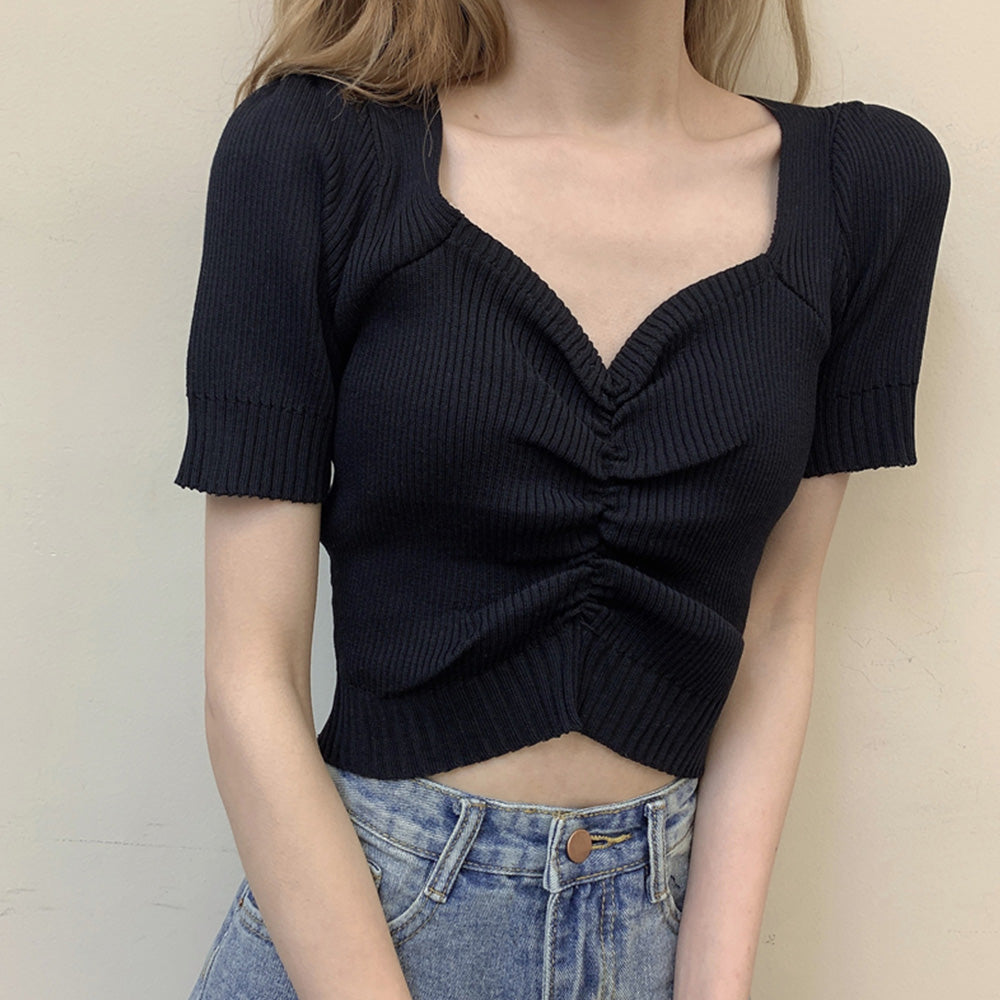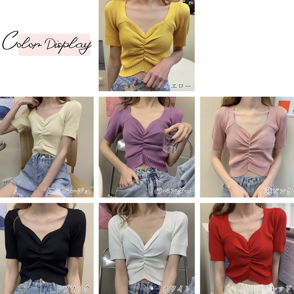 ニットトップス レディース 春夏 スクエアネック 半袖 カットソー デコルテ