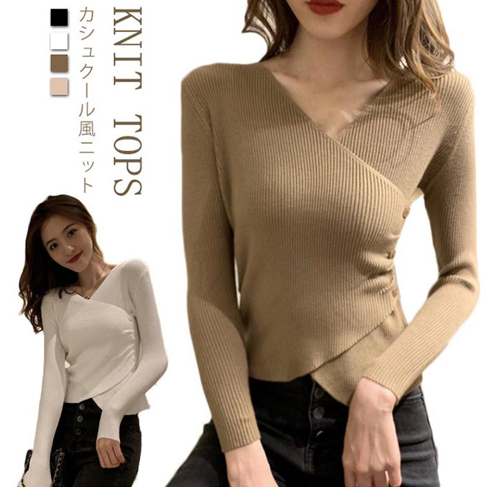カシュクール風 リブニット レディース トップス ボダン ニットトップ セーター オフィス きれいめ