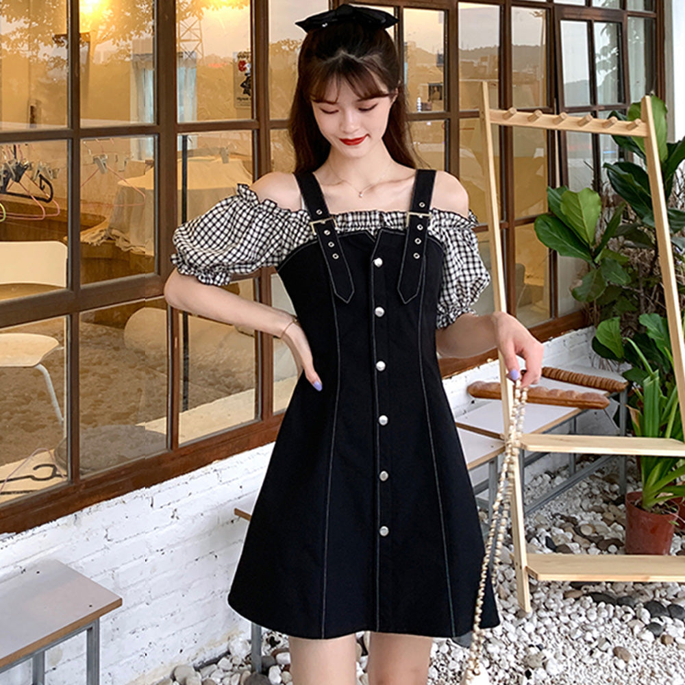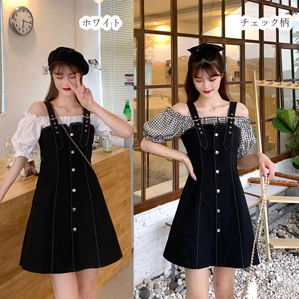 ワンピース 学生風 フリル襟 チェック柄 Aライン 配色 レディース ボリューム半袖 ひざ上丈スカート