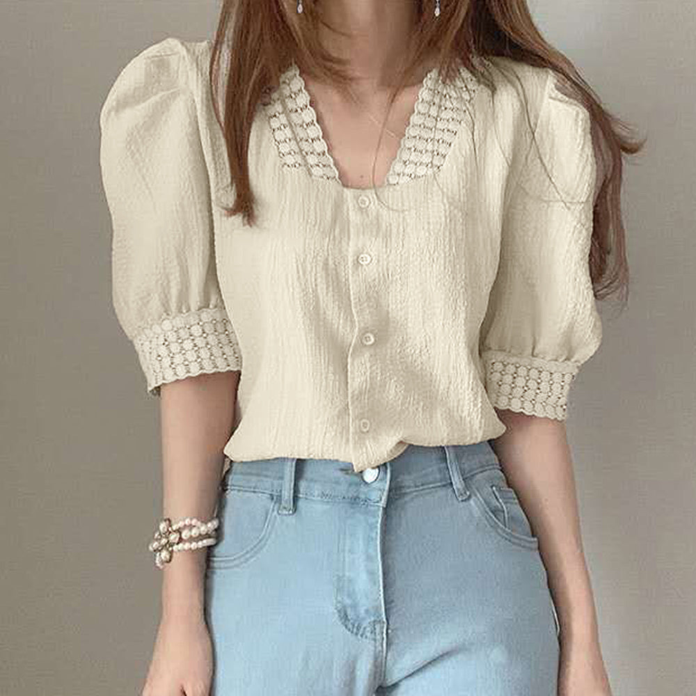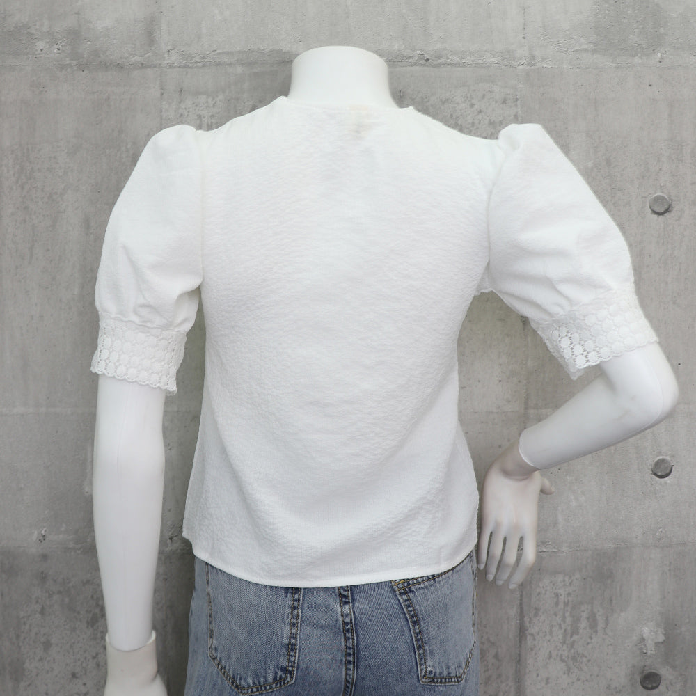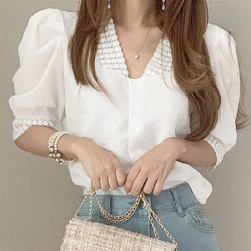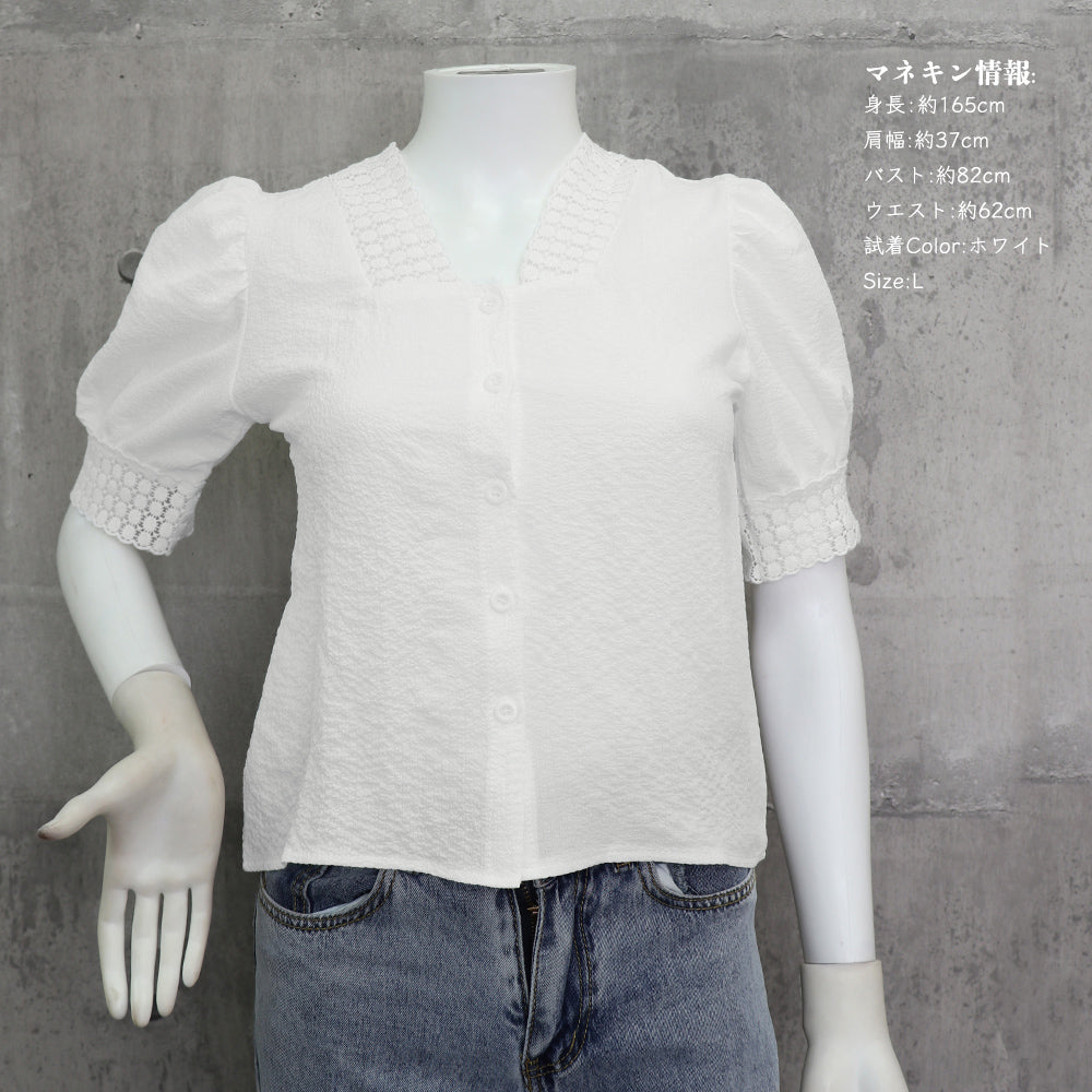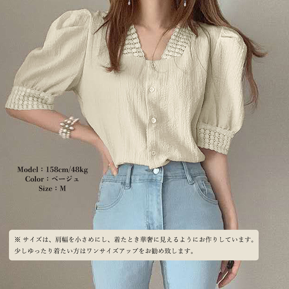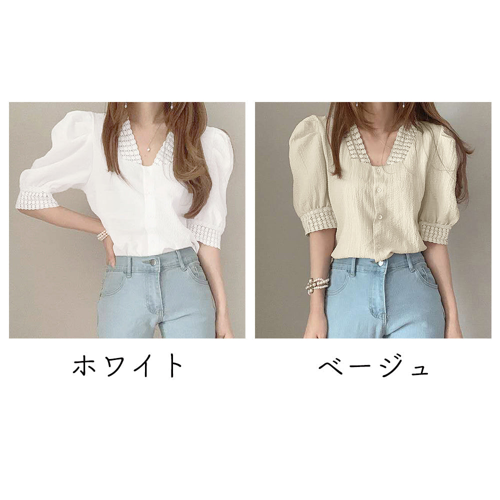 ブラウス レース 半袖シャツ 透け感 薄手 Vネック パフスリーブ 刺しゅう 着やせ カジュアル