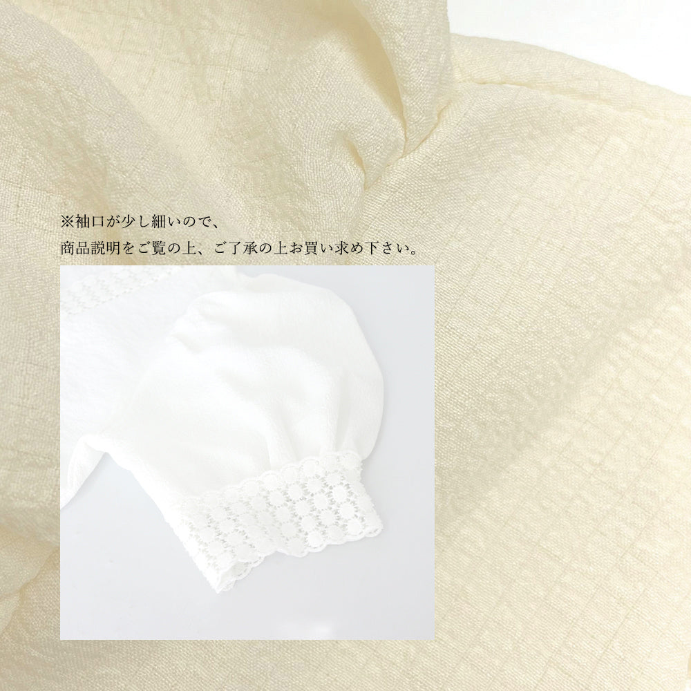 甘くなりすぎず、大人っぽい一枚。 素材:ポリエステル75%+綿25% カラー:ホワイト/ベージュ サイズ:S/M/L/XL [S]着丈:約49cm 肩幅:約32cm 袖丈:約26.0cm 袖口周:約26.0cm ゆき:約42cm 身幅:約44cm 胸囲:約88cm [M]着丈:約50cm 肩幅:約33cm 袖丈:約26.5cm 袖口周:約27.0cm ゆき:約43cm 身幅:約46cm 胸囲:約92cm [L]着丈:約51cm 肩幅:約34cm 袖丈:約27.0cm 袖口周:約28.0cm ゆき:約44cm 身幅:約48cm 胸囲:約96cm [XL]着丈:約52cm 肩幅:約35cm 袖丈:約27.5cm 袖口周:約29.0cm ゆき:約45cm 身幅:約50cm 胸囲:約100cm 裏地:なし 伸縮性:なし 透け感:ややあり