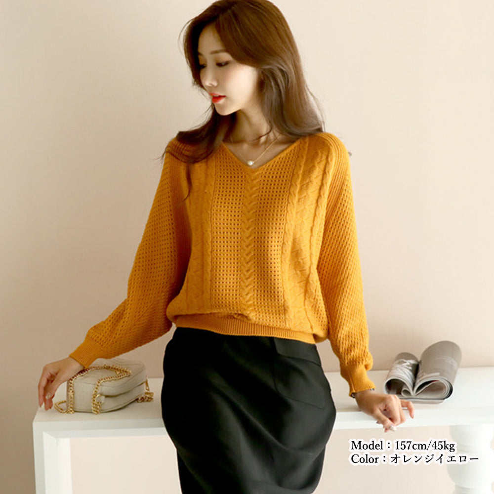 ドルマンニットニット きれいめ 透かし編み Vネック 柔らかい着やせニットソー可愛いフェミニンベーシックお洒落レイヤード エレガント通勤OL オフィスカジュアル プルオーバー重ね着 ふわっとした柔らかな手触りが心地良いケーブル編みニットトップス ドルマンデザインが着になる体型をしっかりカバー 程よくゆとりのあるシルエットで華奢魅せ、大人フェミニンな印象に 素材:ポリエステル75%+アクリル25% カラー:オフホワイト/ダークベージュ/薄ピンク/テラコッタ/オレンジイエロー サイズ:ワンサイズ 着丈:約57cm ゆき:約66cm 身幅:約50cm 胸囲:フリー 裏地:なし 伸縮性:あり 透け感:あり
