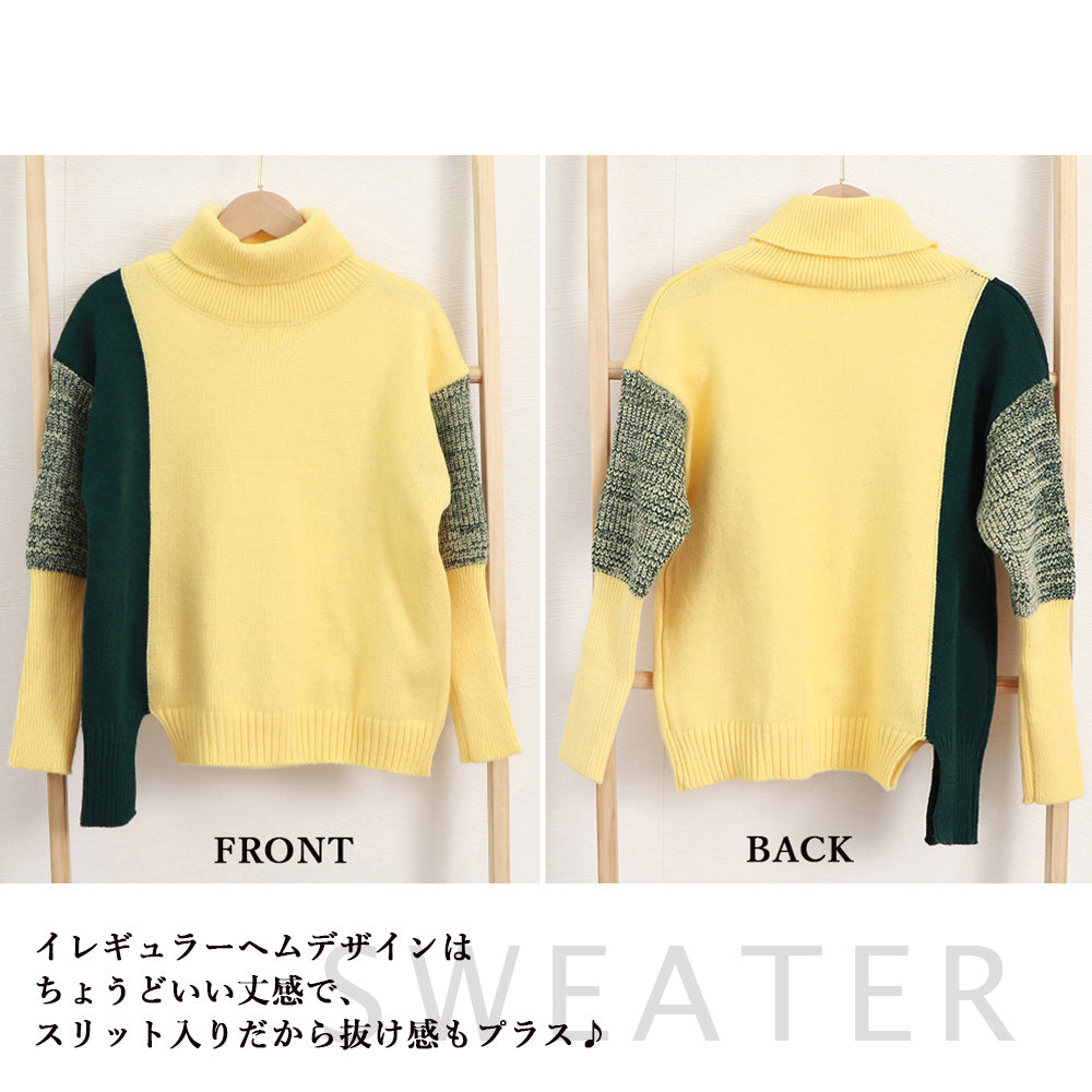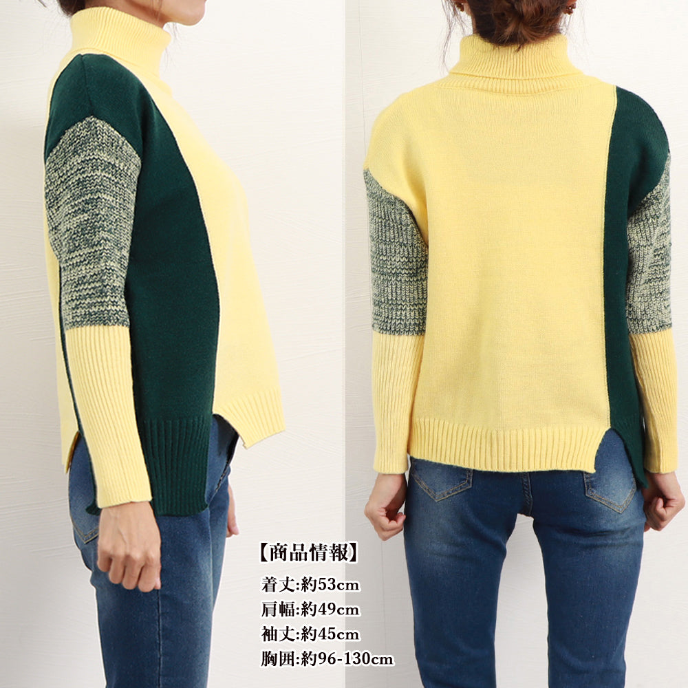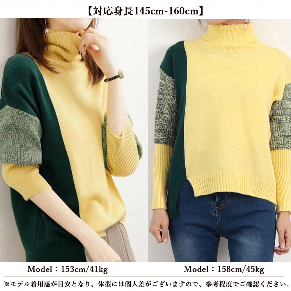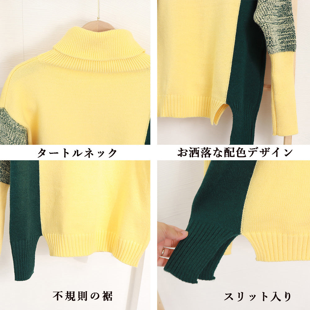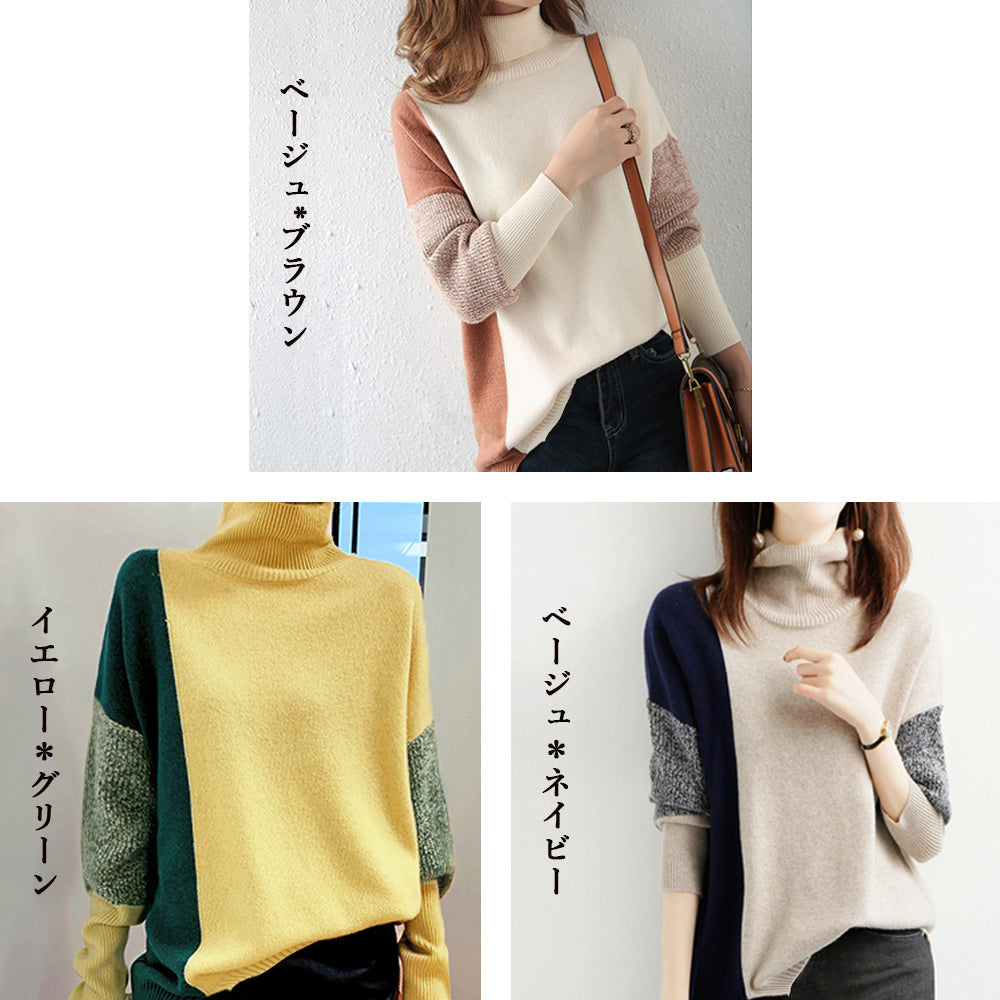配色 タートルネック ニット レディース 秋冬 ハイネック 長袖ニットトップス スリット入り ニットセーター