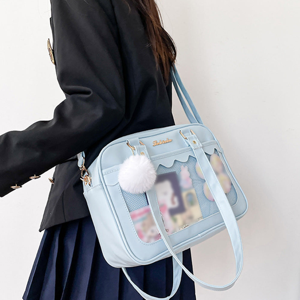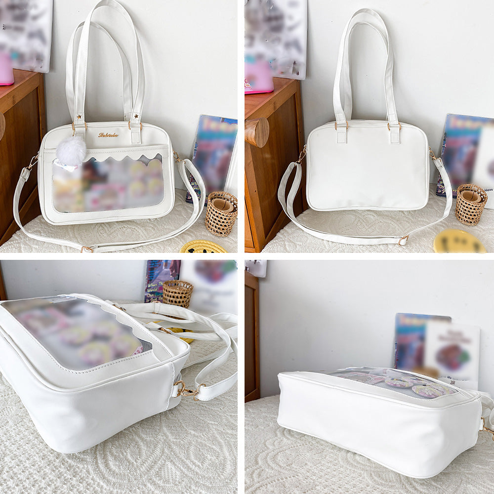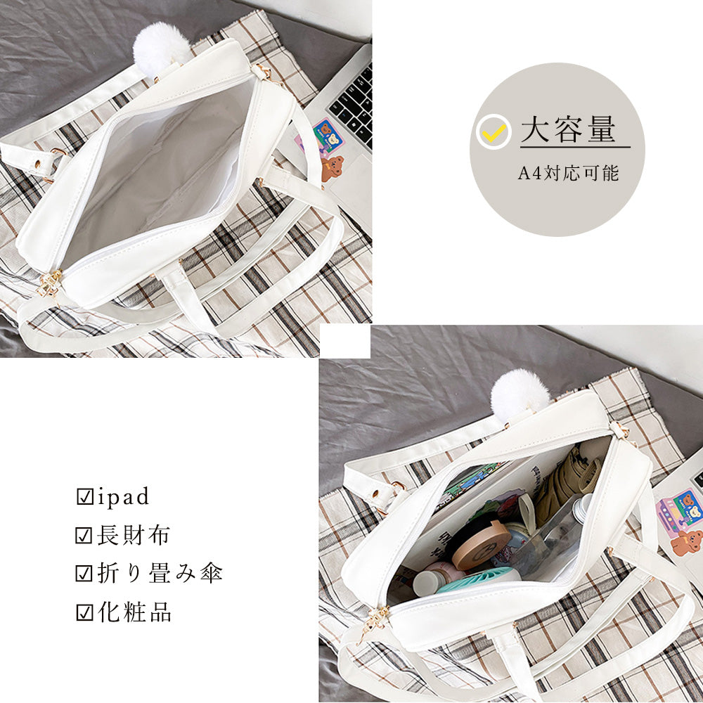 可愛い 2WAY スクールBAG 肩掛け PUレザー 斜め掛けかばん クリア 学生カバン トートバッグ通学バッグA4 魅せバッグ中学生 JKバッグ 流行り 透明痛バ 大容量 肩に掛けたり、ショルダーバッグとしても使える便利な2WAYスクールバッグ オシャレに敏感な女子中高生の注目アイテム♪ 外見が可愛いだけでなく、A4サイズの収納できる大容量で通学にぴったり 軽くてちょうどよいサイズ感、通学はもちろん放課後や習い事修学旅行のサブバッグなど、毎日使える大人気スクールバッグ! 進学やお誕生日などのプレゼントにもオススメ 素材:合成皮革+PVC カラー:ブラック/ホワイト/ピンク/薄ブルー サイズ: 高さ:約22cm 底横幅:約30cm マチ:約9cm 持ち手高さ:約33cm(調節不可、取り外し不可) ショルダー:約66-124cm(調節可、取り外し可) 重さ:約465g 裏地:あり 内ポケット:あり