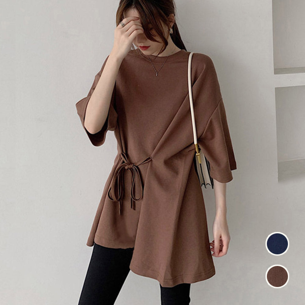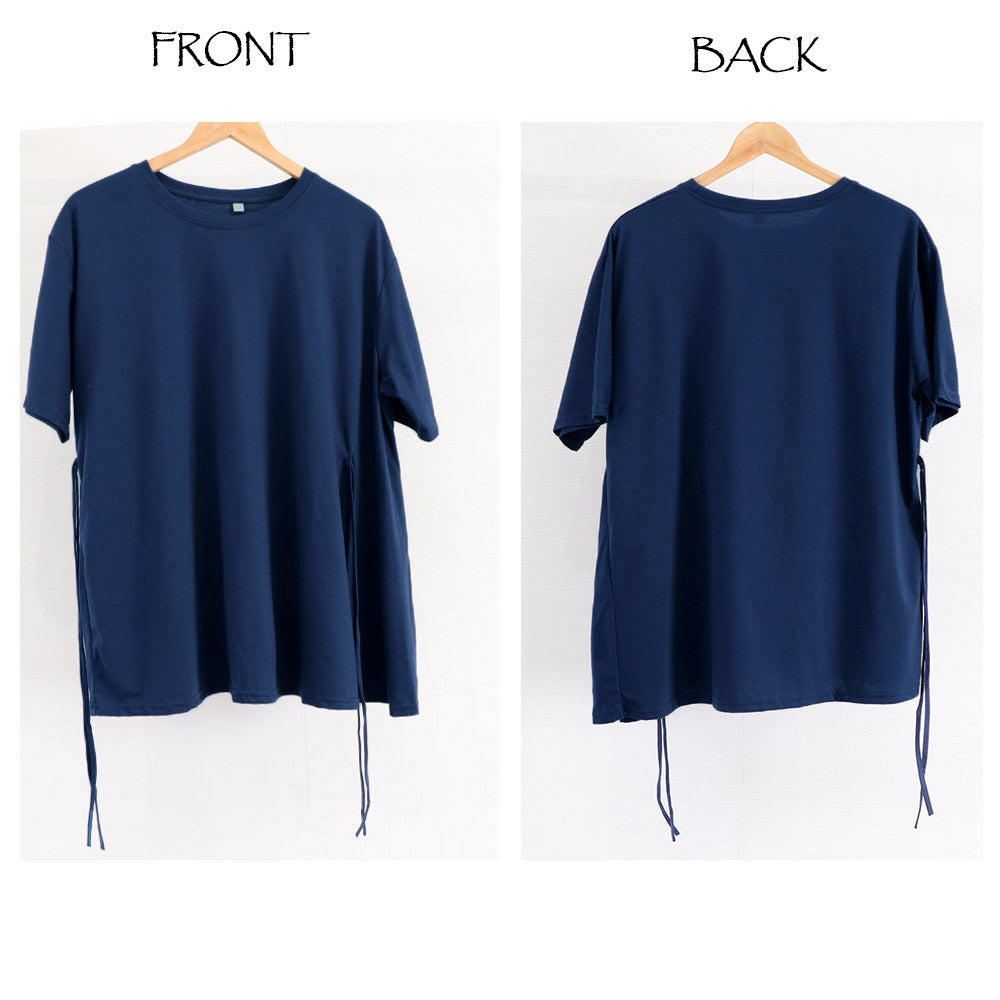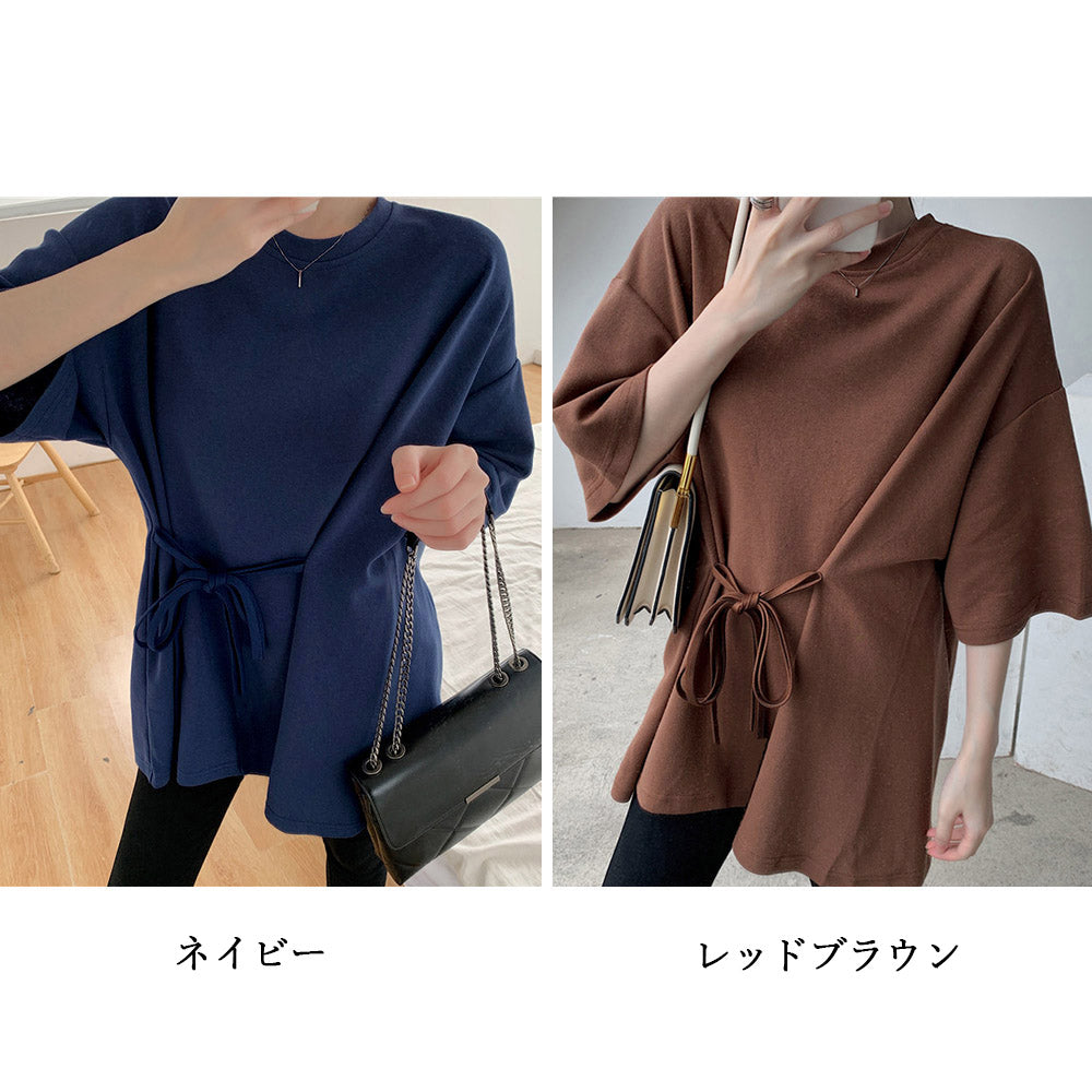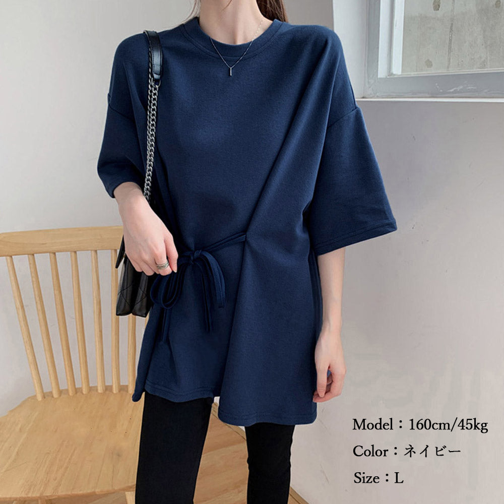 半袖Tシャツ オーバーサイズ ロング丈トップス 着やせ オフィスカジュアル マタニティ ビッグTシャツ おしゃれ Tシャツ体型カバー サマーTシャツ人気 シンプルカットソー 一枚でワンピースやチュニック風にシンプルに着こなせる半袖ロング丈Tシャツ ヒップまで隠れて体型カバーがバッチリ、2本のコードを結ぶとスタイリッシュな印象になる トレンドライクなオーバーサイズとドロップショルダーでこなれ感を演出する1枚 素材:ポリエステル70%+綿30% カラー:ネイビー/レッドブラウン サイズ:L/XL/2XL [L]着丈:約70cm 肩幅:48約cm 袖丈:約21cm ゆき:約45cm 身幅:約58cm 胸囲:約116cm [XL]着丈:約72cm 肩幅:約50cm 袖丈:約22cm ゆき:約47cm 身幅:約60cm 胸囲:約120cm [2XL]着丈:約74cm 肩幅:約52cm 袖丈:約23cm ゆき:約49cm 身幅:約62cm 胸囲:約124cm 裏地:なし 伸縮性:なし 透け感:なし