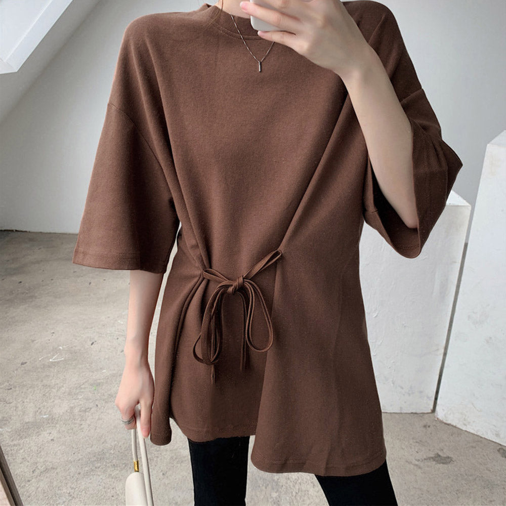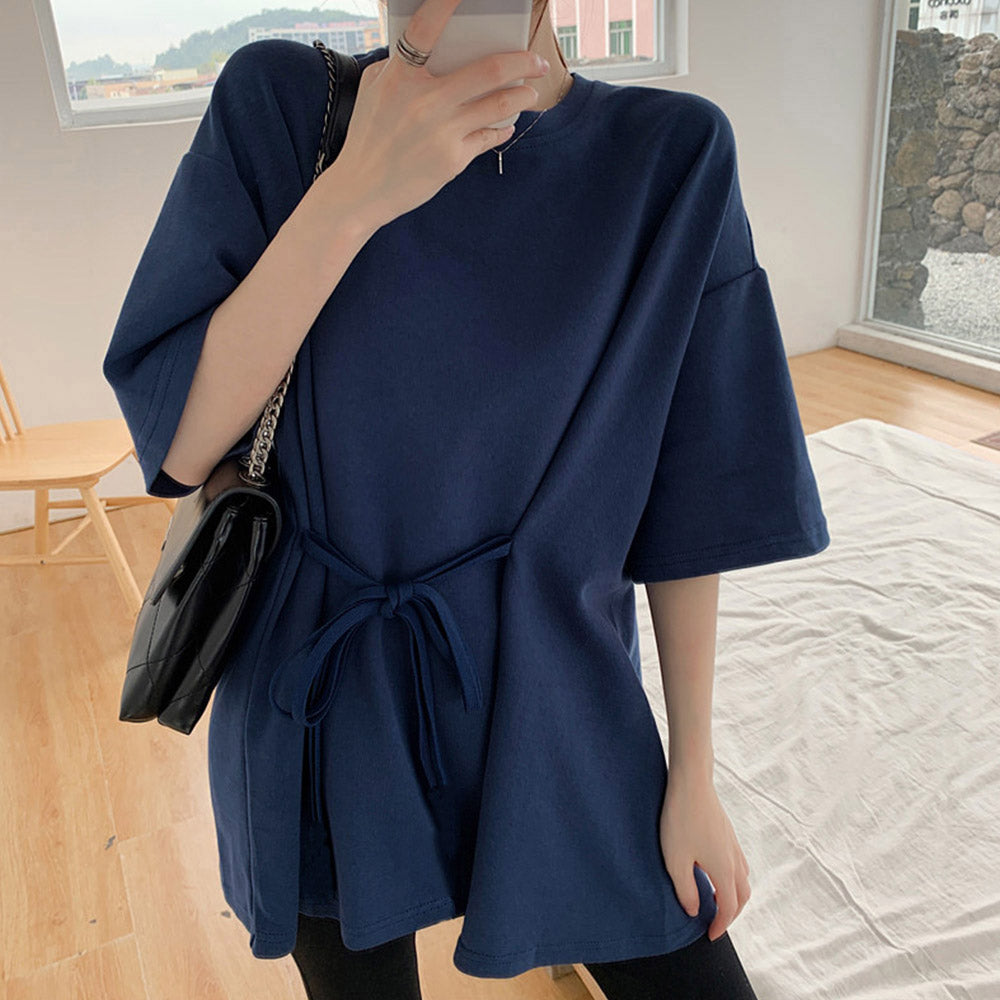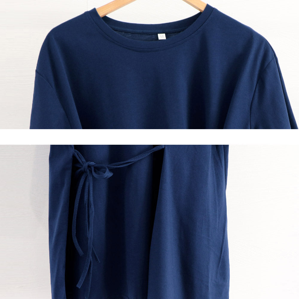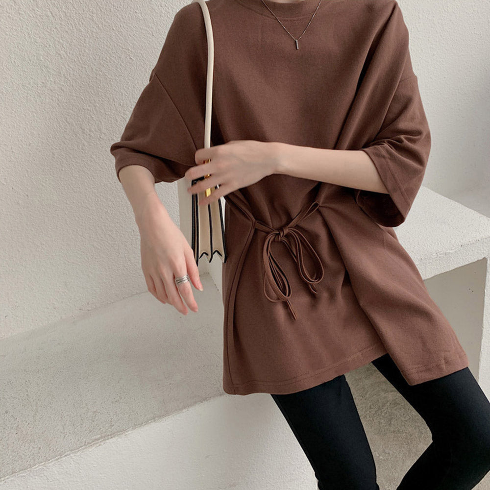 半袖Tシャツ オーバーサイズ ロング丈トップス 着やせ オフィスカジュアル マタニティ ビッグTシャツ おしゃれ Tシャツ体型カバー サマーTシャツ人気 シンプルカットソー 一枚でワンピースやチュニック風にシンプルに着こなせる半袖ロング丈Tシャツ ヒップまで隠れて体型カバーがバッチリ、2本のコードを結ぶとスタイリッシュな印象になる トレンドライクなオーバーサイズとドロップショルダーでこなれ感を演出する1枚 素材:ポリエステル70%+綿30% カラー:ネイビー/レッドブラウン サイズ:L/XL/2XL [L]着丈:約70cm 肩幅:48約cm 袖丈:約21cm ゆき:約45cm 身幅:約58cm 胸囲:約116cm [XL]着丈:約72cm 肩幅:約50cm 袖丈:約22cm ゆき:約47cm 身幅:約60cm 胸囲:約120cm [2XL]着丈:約74cm 肩幅:約52cm 袖丈:約23cm ゆき:約49cm 身幅:約62cm 胸囲:約124cm 裏地:なし 伸縮性:なし 透け感:なし